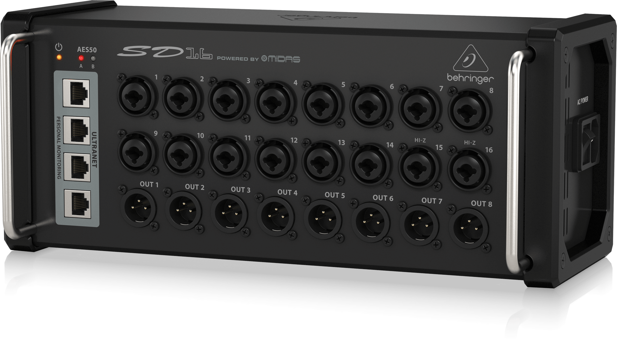 Встроенный распределительный порт ULTRANET обеспечивает питание и 16 аудио каналов к четырем BEHRINGER POWERPLAY P16-M через экранированный кабель CAT5e. Два программируемых входа совместимы с источниками Hi-Z, для подключения клавишных, акустических, бас-гитар, и т.д., без необходимости использования DI бокса. SD16 также оснащен портом USB для быстрого и легкого обновления системы через ПК.