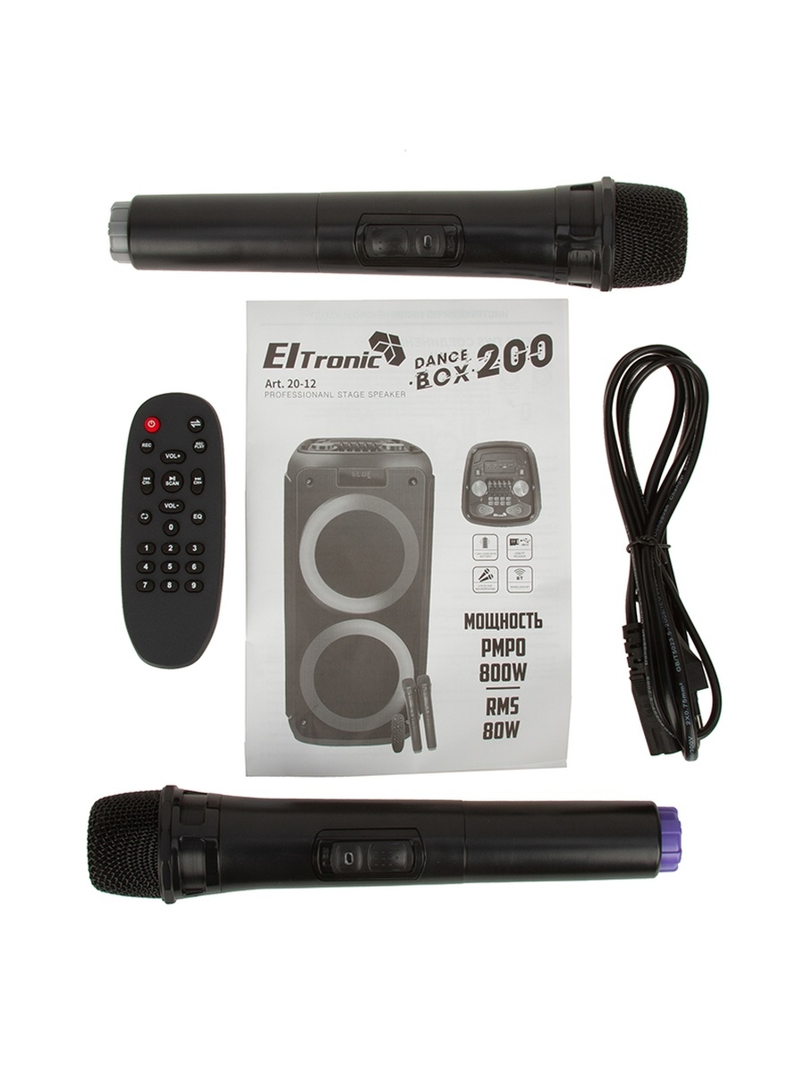 Микрофон беспроводной -2 шт, Пульт Д/У, Кабель питания |
