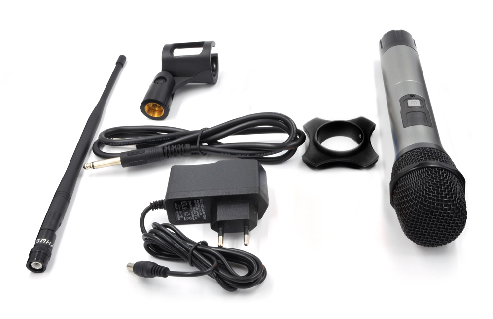 Стационарный приемник 710-726 MГц (одноканальный);Ручной микрофон;Аудио кабель jack-jack;Адаптер питания 12 В;Руководство пользователя;Держатель микрофона;Силиконовое кольцо |