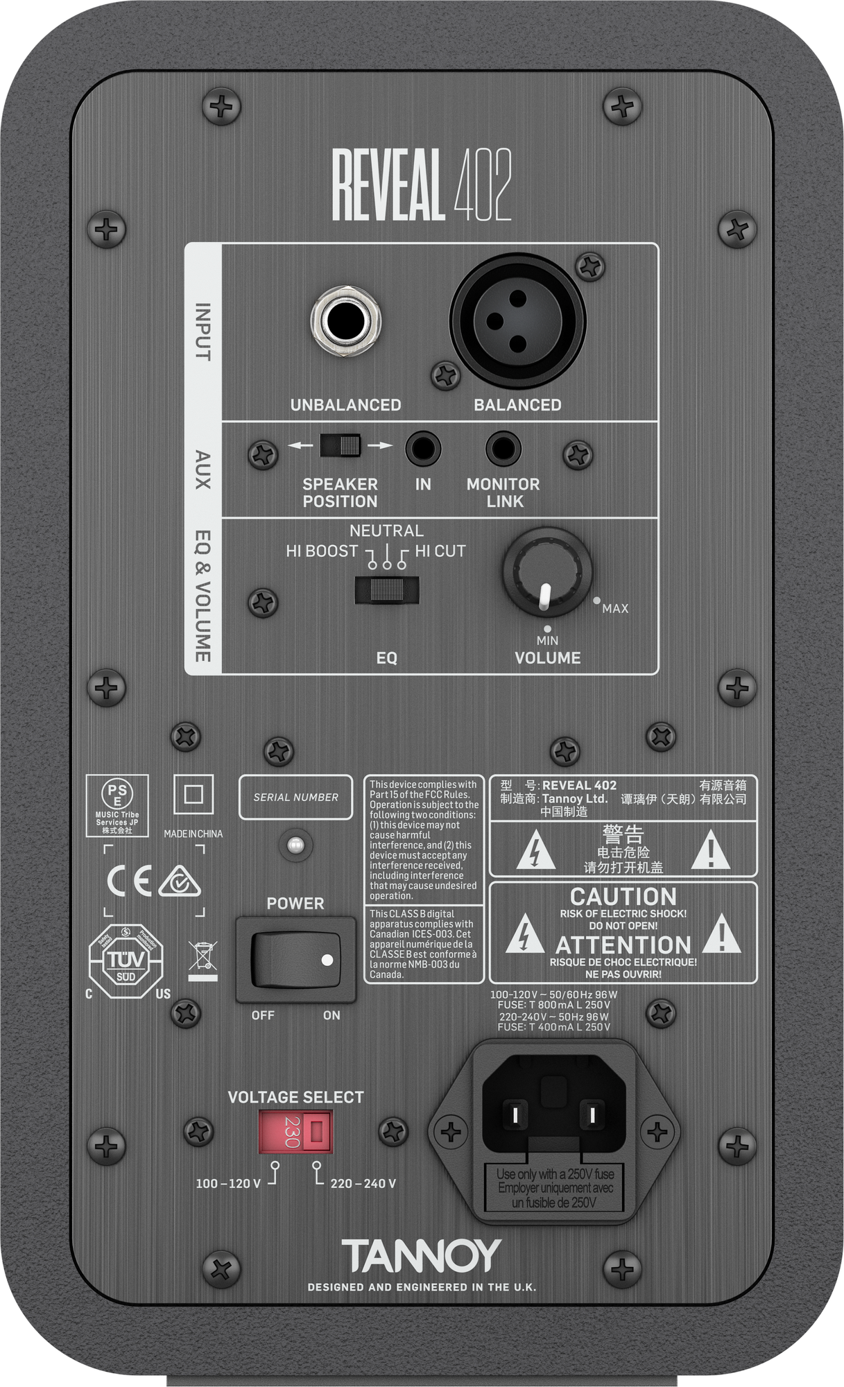 В корпусе Tannoy Reveal 402 находятся два усилителя мощностью 25+25 Вт. На тыловой панели корпуса расположено два входа: один небалансный TRS 1/4" Jack и один балансный XLR-F. Рядом можно найти регулятор громкости и переключатель встроенного эквалайзера, который используется для подстройки нижних или верхних частот: устраняется лишний гул, либо излишняя яркость соответственно.