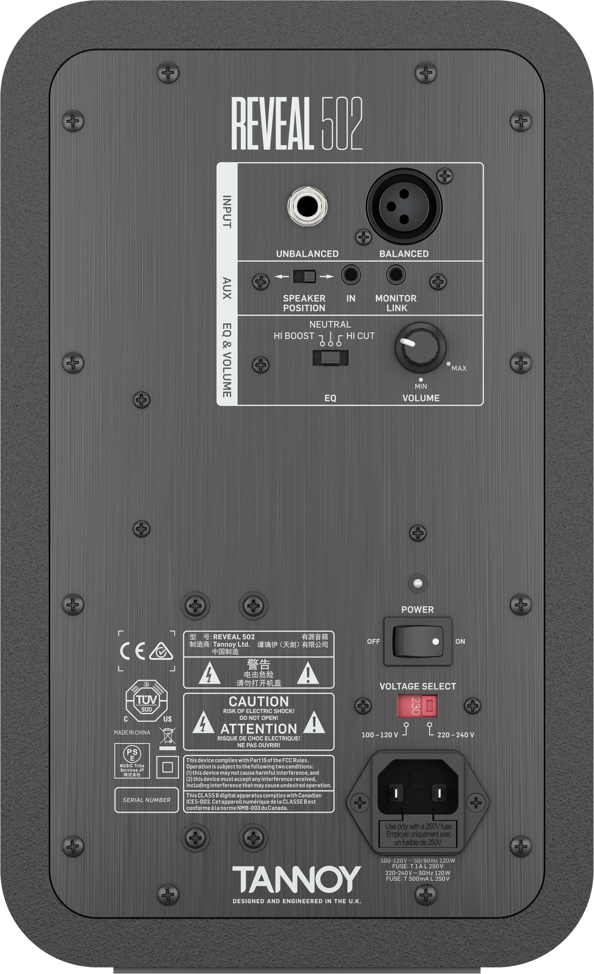 В корпусе Tannoy Reveal 502 находятся два усилителя мощностью 50+25 Вт. На тыловой панели корпуса расположено два входа: один небалансный TRS 1/4" Jack и один балансный XLR-F. Рядом можно найти регулятор громкости и переключатель встроенного эквалайзера, который используется для подстройки нижних или верхних частот: устраняется лишний гул, либо излишняя яркость соответственно.