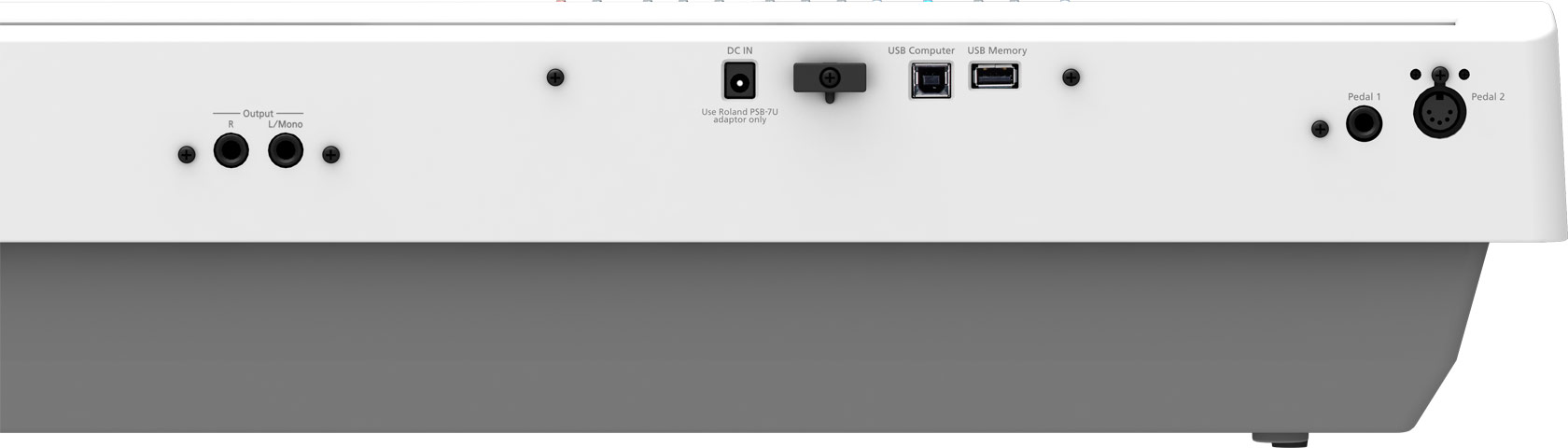 1 x 1/4'' Jack TRS pedal in (damper), 1 x 5-pin DIN pedal in (damper, sostenuto, soft), 2 x 1/4'' Jack TS main out, 1 x 1/8'' Jack TRS phones out, 1 x 1/4'' Jack TRS phones out, 1 x USB-A, 1 x USB-B