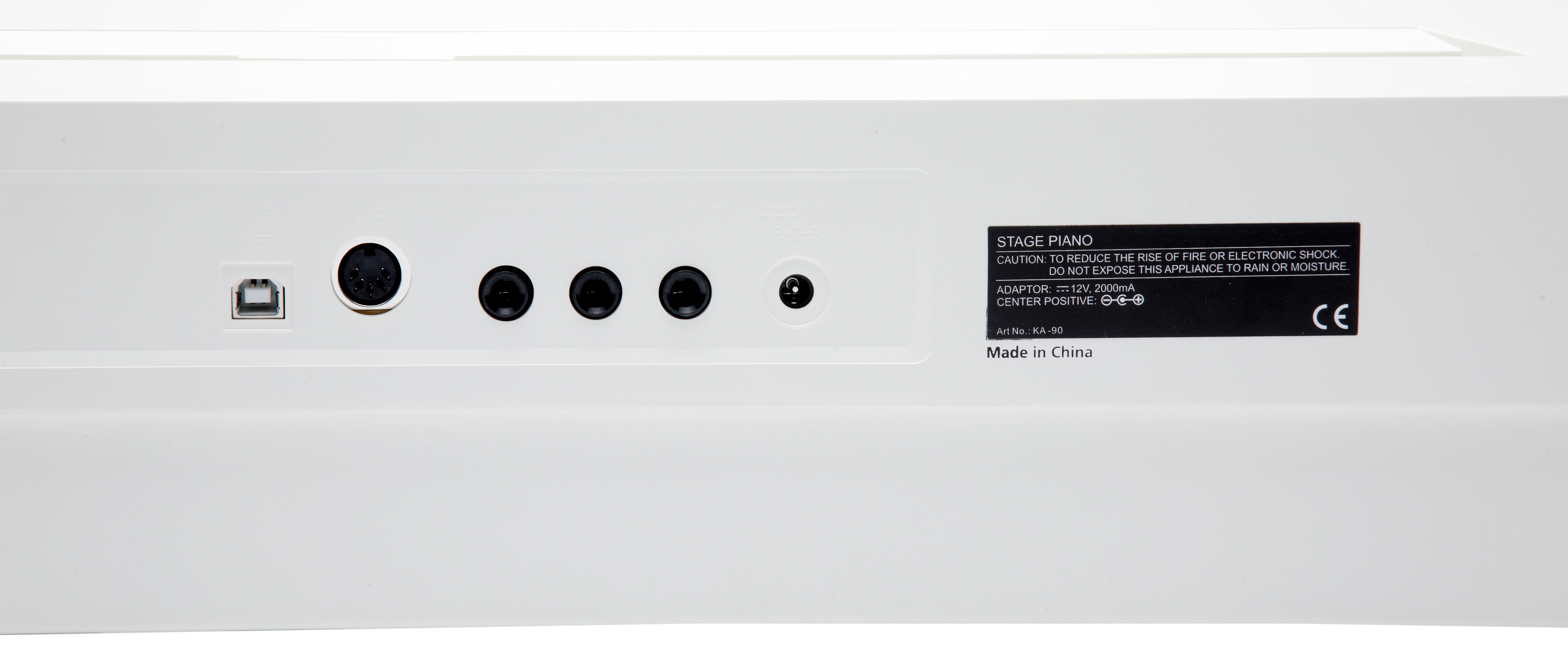Для подключения внешнего источника звука к пианино и вывода аудиосигнала с инструмента на акустическую систему есть стереофонические вход и выход AUX, сделанные на разъемах 1/4'' Jack TRS. Таким же разъемом представлен и выход для наушников. Подключить комплектный свитч/педаль сустейна можно к входу на разъеме 1/4'' Jack TS. Для опционального 3-педального блока есть отдельный вход, расположенный на нижней части корпуса. Подключение к компьютеру и обмен MIDI-информацией осуществляется посредством порта USB-B. Для связи с дополнительным оборудованием имеется MIDI-выход на 5-контактном коннекторе DIN. Питание осуществляется от адаптера на 15 V DC, который поставляется в комплекте. Для экономии энергии имеется режим автоматического отключения после 30 минут простоя.