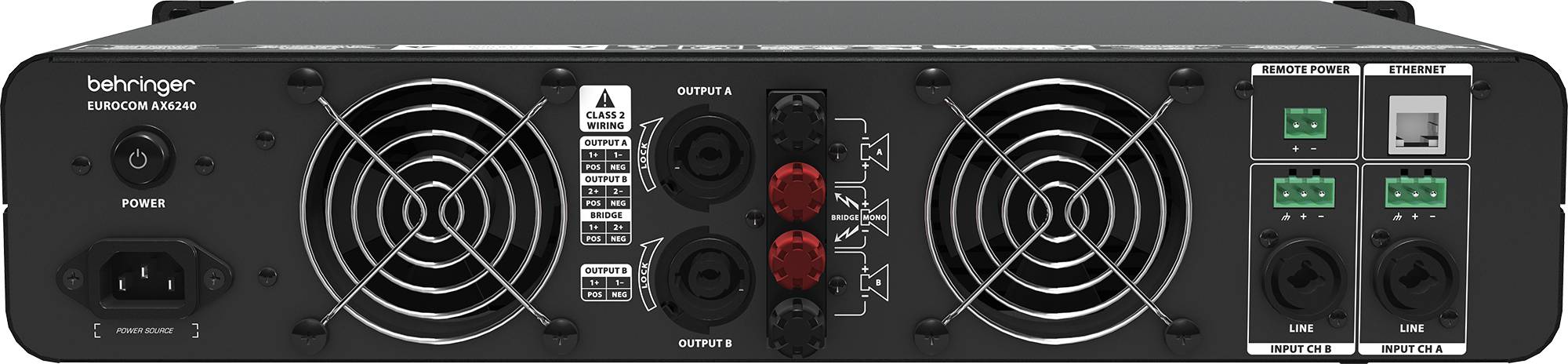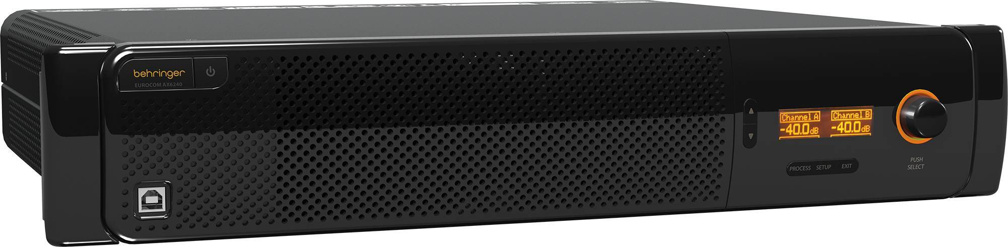Благодаря преобразователям 24-бит/96кГц, которые обеспечивают цифровое преобразование звука без потери качества, секция DSP усилителя AX6240/AX6220 имеет необычайно широкий динамический диапазон при наличии таких разнообразных опций обработки звука, как задержка, кроссовер, динамические эффекты, а так же параметрический (8-полосный) и динамический (2-полосный) эквалайзер. Настраиваемые параметры могут сохраняться при помощи интуитивных элементов управления на передней панели и ЖК-дисплея с желтым цветом свечения, на котором так же отображается уровень выходного сигнала, индикация блокировки звука, системной ошибки, превышения по току и перегрузки. На передней панели так же имеется основной регулятор громкости с подсветкой и индикатором пиковых уровней сигнала. Для целей удаленного управления и контроля, компания BEHRINGER предлагает мощную программу Amp Remote, которую можно установить как на ПК, подключаемый на месте установки через USB-порт на передней панели усилителя, так и на удаленный ПК, подключаемый через разъем сети Ethernet на задней панели усилителя. Изменение параметров может быть запрещено настройками доступа.