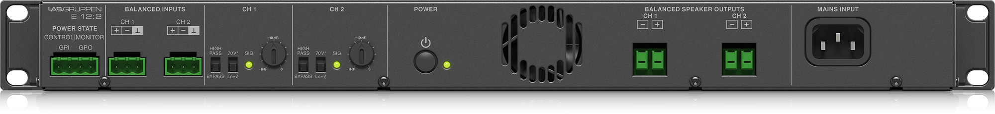 Все входные разъемы Lab.gruppen E 12:2 выполнены в виде терминалов Euroblock. Плюс ко всему, у данного усилителя есть планка Euroblock-разъемов GPI/O для подключения удаленного управления: с его помощью можно переключать каналы, контролировать уровень звука и легко интегрировать усилитель в пейджинговые системы.
