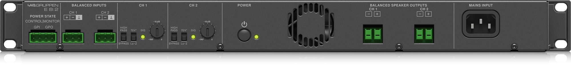 Lab.gruppen E 8:2 несет в себе массу инноваций. Это включает в себя технологию IDEEA (IntelliDrive Energy Efficient Amplifier), которая позволяет усилителю иметь очень высокую выходную мощность с очень низким уровнем искажений при минимальном потреблении тока, а также оптимизировать низко- и высокомпедансные выходы. На пару с IDEEA работает и технология Rail Sensing Limiter (RSL), которая является лимитером, ограничивающим выходной сигнал при появлении его клиппинга. Также схемотехника соответствует энергосберегающему стандарту Energy Star и автоматически отключается после 20 минут неактивности, потребляя в этом режиме ожидания менее 1 Вт. Есть и защита от короткого замыкания и неверных показаний индикаторов.