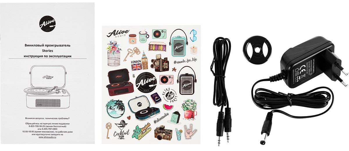 Комплект поставки: Проигрыватель, адаптер питания 220 В, адаптер на 45 оборотов
